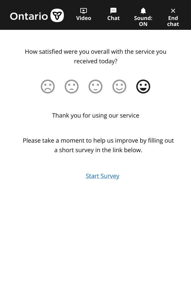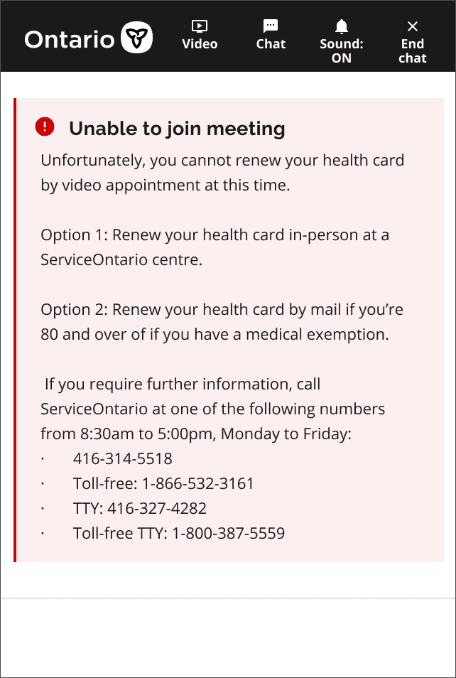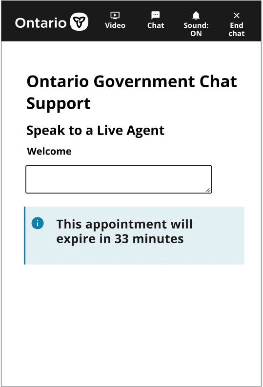 The Ministry of Public and Business Service Delivery needed to modernize its citizen support experience by integrating secure video chat into the existing live chat system. The goal was to create a seamless and accessible escalation path for users who needed real-time assistance while meeting strict government requirements for privacy, accessibility, and technical feasibility. The redesign needed to support a diverse population, accommodate assistive technologies, and function reliably across devices and network conditions.