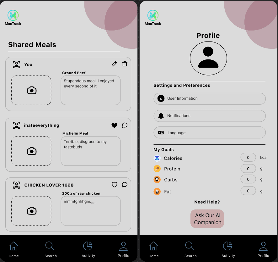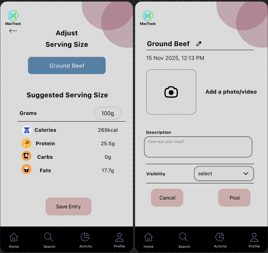 The final design delivers a responsive, intuitive mobile experience centered around fast logging, real‑time macro tracking, and community engagement. Key features include: