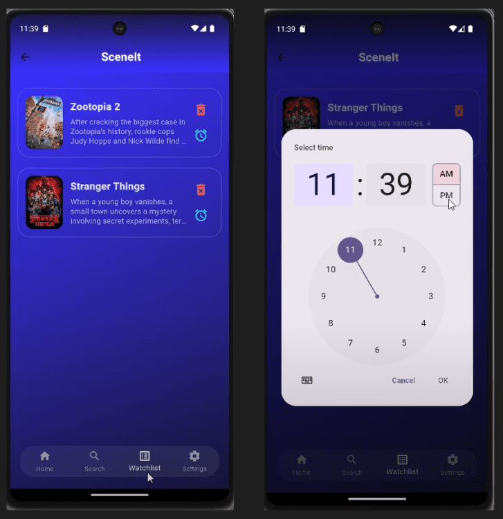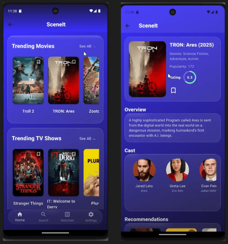 SceneIt is a mobile entertainment app designed to help users discover trending movies and TV shows, explore cast and synopsis details, and build a personalized watchlist. Created as a capstone project for a mobile development course, the app demonstrates production‑ready UX, multi‑screen navigation, and real‑time data integration. The goal was to design an experience that feels intuitive, visually engaging, and immediately usable without onboarding.