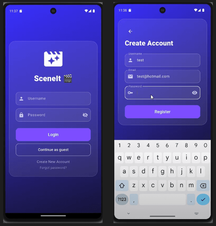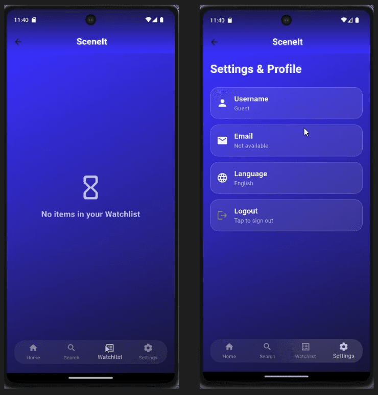 The final app was tested on Android devices and met all course requirements for accessibility, responsiveness, and UX clarity. SceneIt demonstrates my ability to design consumer‑facing mobile experiences with strong visual craft, thoughtful interaction design, and production‑ready implementation.